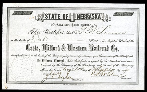 Crete, Milford & Western Railroad Co., 1890 Stock Certificate. Nebraska. 1890. 1 Share, Cert. # 12, Black border, no vignette, Issued and uncancelled, XF condition. Rare.