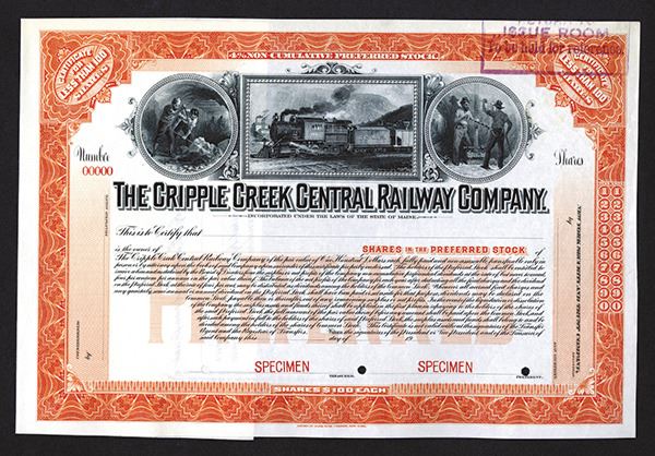 Colorado. <100 Shares Preferred Specimen Stock Certificate. Black ink with orange border and under print. Vignette of locomotive at center with miners working at sides. Specimen overprints, POC's, VF, ABNC.