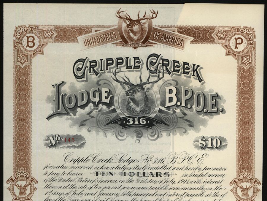 Colorado, 1896, $10, Unissued 10% 1st Mortgage Bond, Black on brown border and underprint, Vignette of Elk in middle of title, VF condition, Western Lithography.