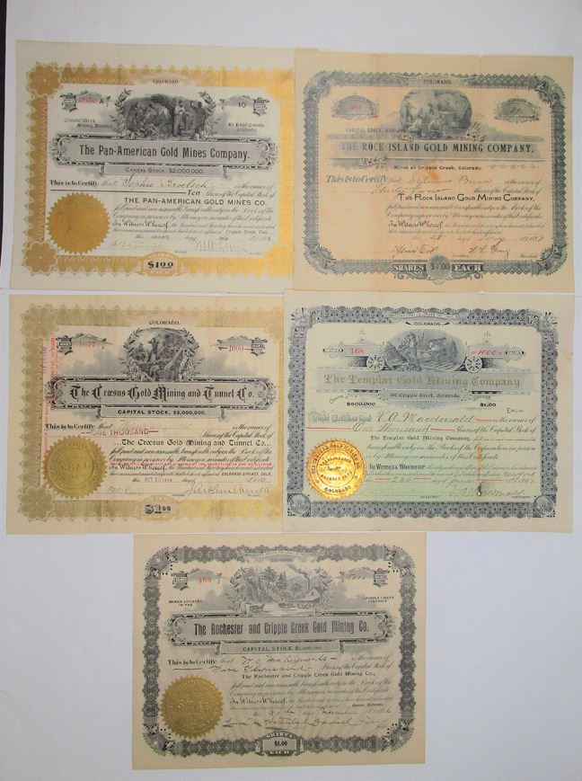 Cripple Creek, Colorado, 1896-99. Lot of 5 Cripple Creek Mining I/U Stock Certificates, Includes: 1899, Croesus Gold Mining and Tunnel Co., 1000 Shares Capital Stock; 1897, Templar Gold Mining Co., 1000 Shares Capital Stock; 1899, Rock Island Gold Mining Co., 34 Shares Capital Stock; 1896, Rochester and Cripple Creek Gold Mining Co., 5000 Shares Capital Stock; and, 1896, Pan-American Gold Mines Co., 10 Shares Capital Stock. All are in VF to XF condition. (5). Sold "AS IS" no returns accepted.