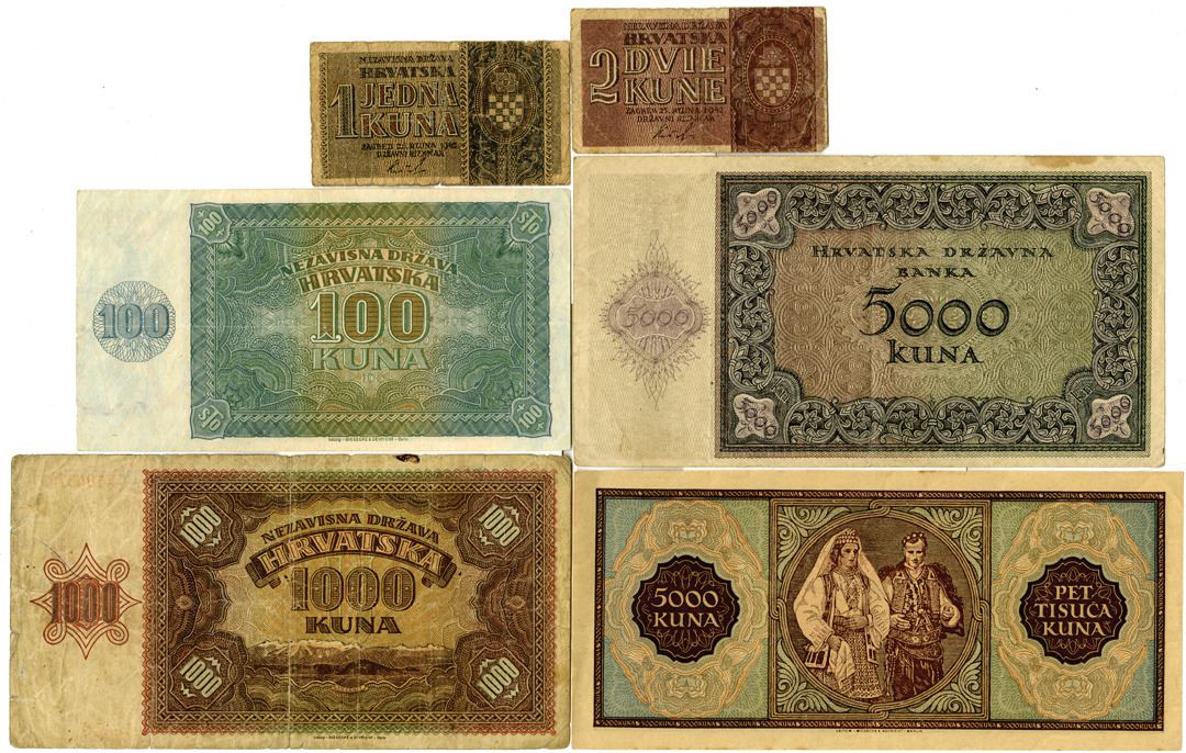Croatia. 1940s. 6 Issued notes : 100 Kuna, P-2a, Dark blue on light brown underprint; 1000 Kuna, P-4A, Brown; 1 Kuna, P-7b, Dark blue on brown; 2 Kune, P-8b, Dark brown on red-brown underprint; 5000 Kuna, P-13a, Brown on red-brown and blue underprint; 5000 Kuna, P-14a, Brown on violet and dull green underprint. Fine to Almost Unc condition.(5)