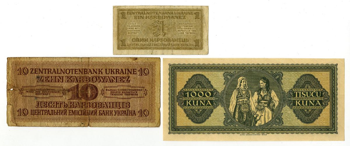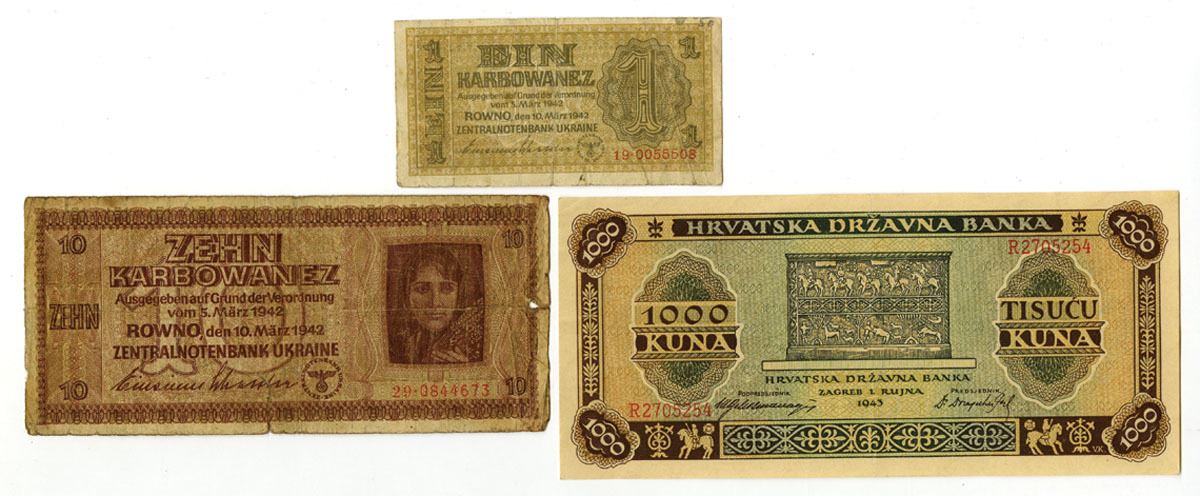 Croatia and Ukraine, 1942-43. Lot of 3 Issued Banknotes, Includes: Croatian State Bank, 1943, 1000 Kuna-Fine. Notes range from VG to AU condition with small faults on the lower grade notes. (3). Sold "AS IS" no returns accepted.
