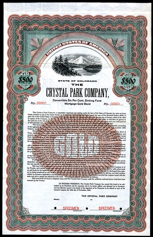Colorado, 1908, $500, Convertible 6% Sinking Fund Mortgage Gold Specimen Bond, Black on multi colored border and underprint, Vignette of mountains with lake in foreground, POC's, VF condition, ABNC.