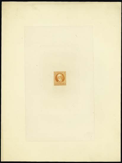 Scott # 265 Type. Large Die Proof printed in unissued light yellow orange color on large off white card that measures 7 x 9.5 inches. Stamp printed on india paper on large card. Stamp is in exceptional condition with extremely small areas of toning on corners of far from india paper Rare in this format and only 3 or 3 found in archive. Printed by SBNC.
