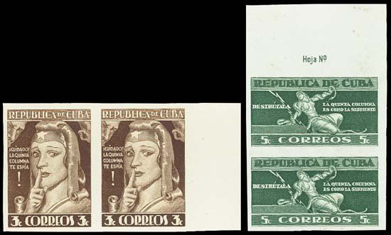 10 different pairs (20 stamps). 1 Centavo, Scott #375 TC in brown on white paper; #375 TC in blue on white paper (issued stamp printed in dark blue green); 3 Centavos, Scott # 376 in brown on whitepaper; Scott # 376 in blue on white paper; Scott # 376 in brown on light brown very thin card. (issued stamp printed in red); 5 Centavos, Scott # 377 TC in yellow green (Issued color was bright blue); 10 Centavos, Scott # 378 TC in green (Issued color was dull brown); 13 Centavos, Scott #379 TC in brown on white paper; #379 TC in green on white paper; #379 TC in brown on light brown thin card (issued stamp printed in dull rose violet). AU to Choice uncirculated. No gum as issued. Rare trial color pairs. SBNC.