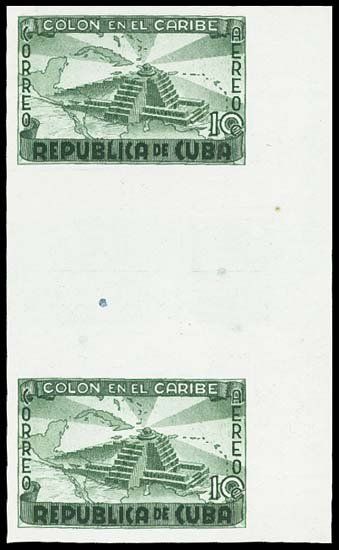 2 Gutter pairs. 5 Centavos. Scott # C36 TC in black (issued color was olive green), imperforate vertical gutter pair printed on white security paper; 10 Centavos. Scott # C37 TC in green (issued color was slate black). Imperforate horizontal gutter pair printed on white security paper. Choice uncirculated. No gum as issued. Rare trial color gutter pairs. SBNC.