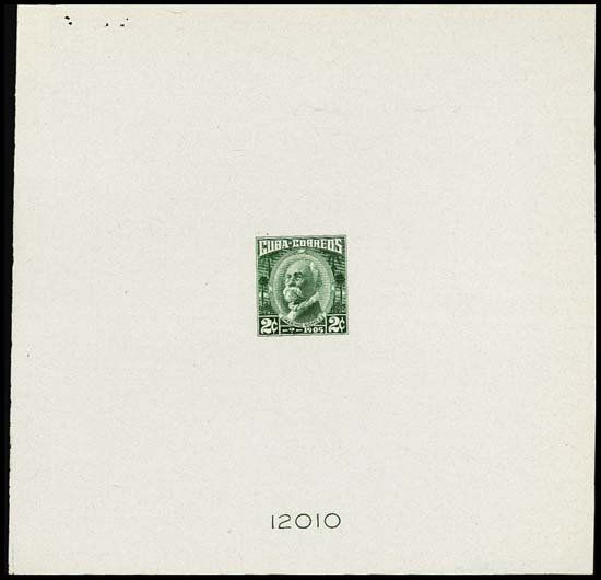 7 Different Large Die Proofs on 5 x 5 inch white bond type of paper. All are printed in green. The 2c is similar to Scott # 520 except it has a "?" in place of date 1833. and also printed in green, not rose carmine; 6c, portrait of Calixto Garcia, unlisted denomination; 10c is similar to Scott #524 but printed in green, not sepia; 12c, portrait of Ignacio Agramamonte, unlisted denomination; 16c, portrait of Miguel Aldama, unlisted denomination; 50c, portrait of Antonio Maceo, printed in green, not issued orange yellow; and, $1, portrait of Carlos Manuel De Cespedes in green, not the issued orange. All have die numbers on bottom. All are in choice uncirculated condition. Rare set of essay color trial and unissued denominations. SBNC but no imprint.