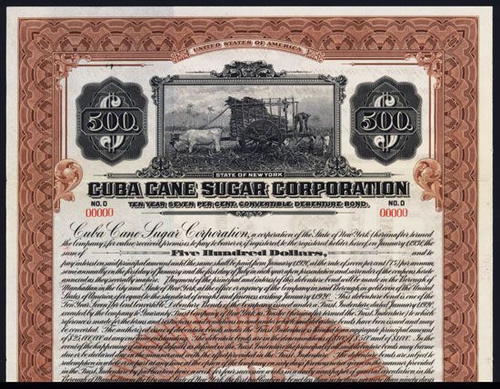 New York, 1920, $500, 10 Year 7% Convertible Debenture Bond, Specimen Bond, Coupons attached, Black on brown border and underprint, Vignette top center of sugar cane workers loading up a cart, Red SPECIMEN overprints POC's and red s/n Ò00000Ó, VF-XF condition, ABNC.