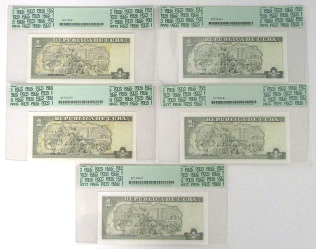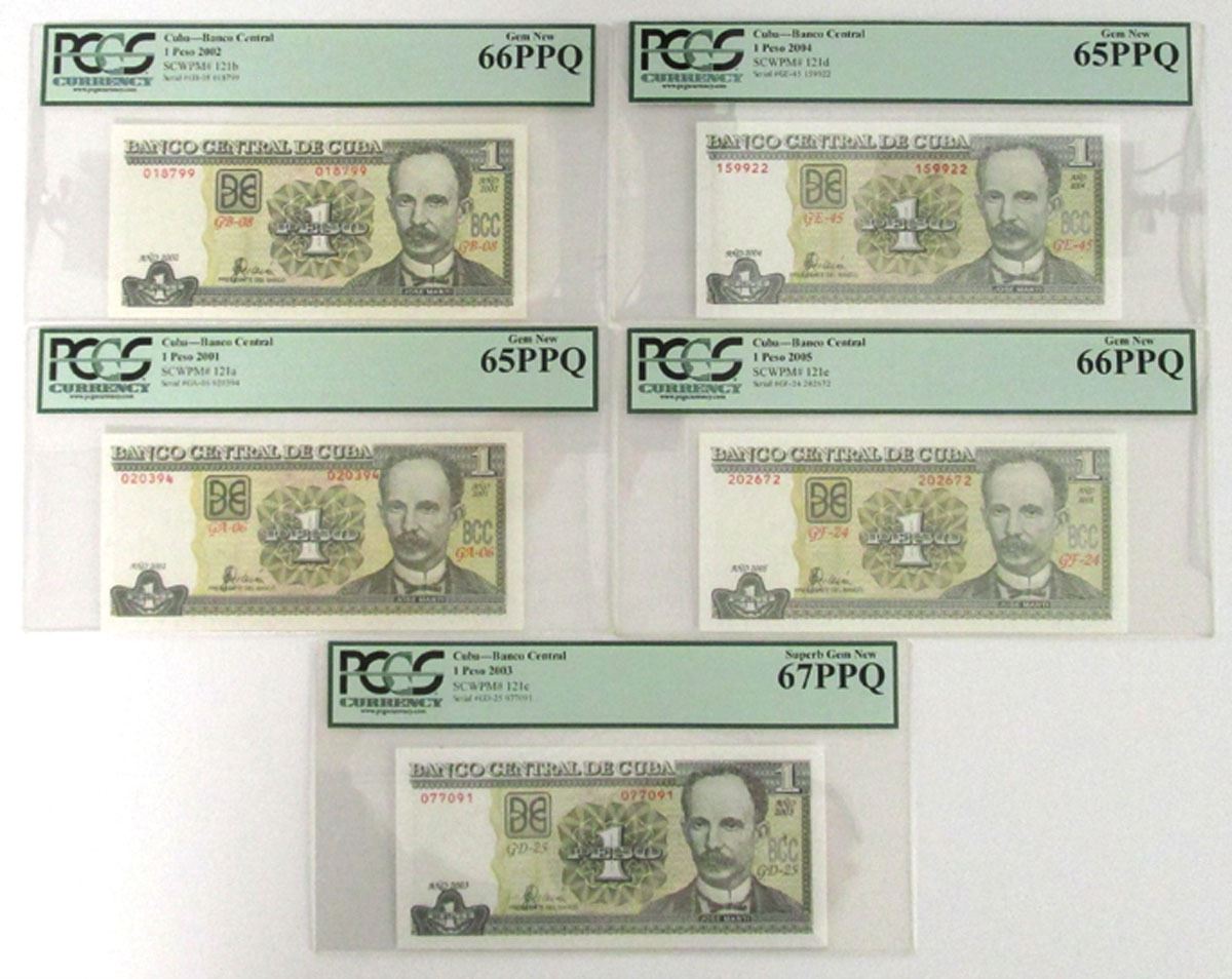Cuba, 2001-2005. Lot of 5 notes, all Legacy graded, Includes 1 Peso, P-121a (2001), Gem New 65 PPQ; P-121b (2002), Gem New 66 PPQ; P-121c (2003), Superb Gem New 67 PPQ; P-121d (2004), Gem New 65 PPQ; and, P-121e (2005), Gem New 66 PPQ, Issued Banknote Collection, Black and olive green printing with portrait of J. Marti at right, Back is green and yellow with Castro victory parade, (5). Sold "AS IS" no returns accepted.