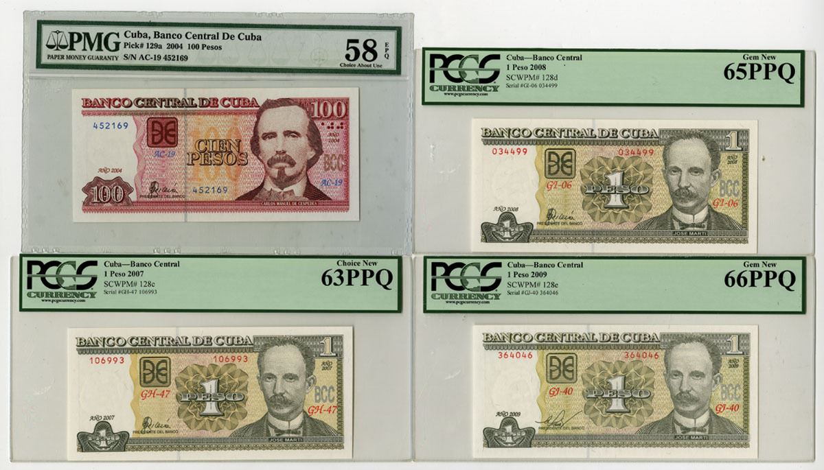 Cuba, 2004-09. Lot of 4 Issued Banknotes, Includes: 1 Peso, P-128c (2007), P-128d (2008), and P-128e (2009), Issued Trio, Black and olive green printing with J. Marti at right, S/Ns GH-47 106993, GI-06 034499, GJ-40 364046, PCGS graded Choice New 63PPQ, Gem New 65PPQ, and Gem New 66PPQ; 100 Pesos, P-129a, 2004, S/N AC-19 452169, PMG graded Choice About Unc 58EPQ. (4). Sold "AS IS" no returns accepted.