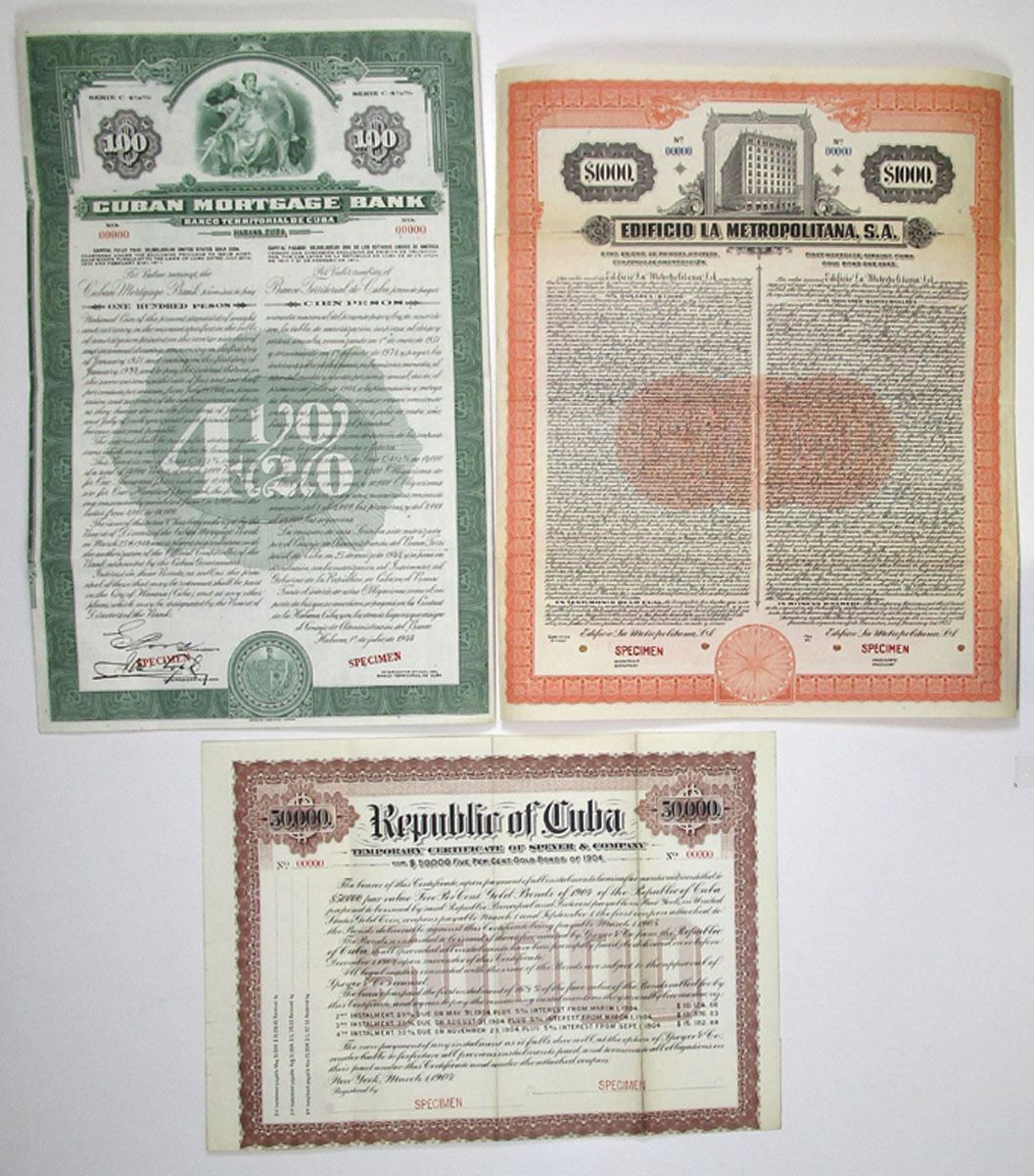 Cuba, 1904-1944. Lot of 3 Specimen Bonds, Includes: 1904, Republic of Cuba, $50,000 5% Gold Coupon Bond, Black with brown border and underprint, 1 coupon attached; 1925, Edificio la Metropolitana, S.A., $1000 7% First Mortgage Sinking Fund Gold Coupon Bond, Black with orange border and underprint; and, 1944, Cuban Mortgage Bank, 100 Pesos 4 1/2% Series C Coupon Bond, Black with green border and underprint. All bonds have Specimen overprints and POCs and are in VF to XF condition. (3). Sold "AS IS" no returns accepted.