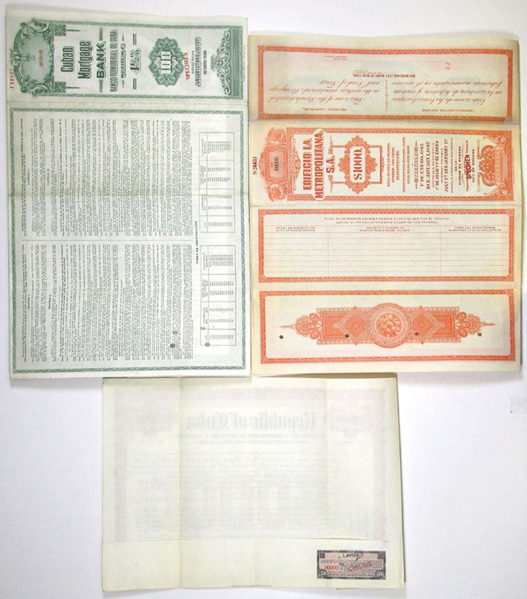 Cuba, 1904-1944. Lot of 3 Specimen Bonds, Includes: 1904, Republic of Cuba, $50,000 5% Gold Coupon Bond, Black with brown border and underprint, 1 coupon attached; 1925, Edificio la Metropolitana, S.A., $1000 7% First Mortgage Sinking Fund Gold Coupon Bond, Black with orange border and underprint; and, 1944, Cuban Mortgage Bank, 100 Pesos 4 1/2% Series C Coupon Bond, Black with green border and underprint. All bonds have Specimen overprints and POCs and are in VF to XF condition. (3). Sold "AS IS" no returns accepted.