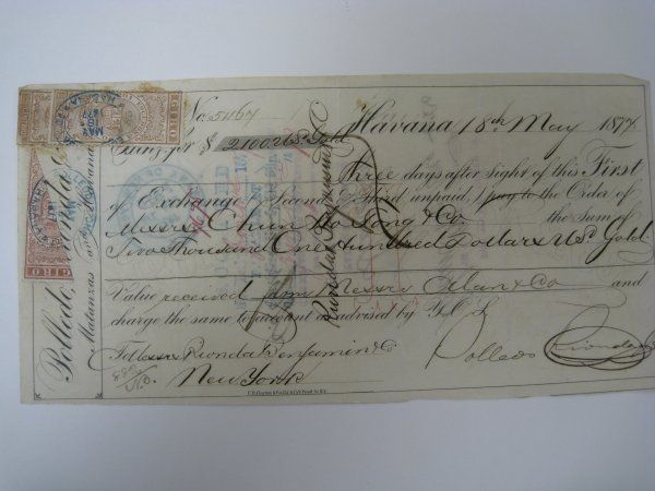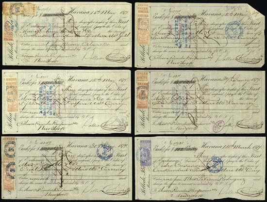 1877. Havana. Issued 1st of Exchange. Made out to Chun Wo Tong & Co., San Francisco. From Riodona & Co., Havana, Cuba. 2 overlapping Cuban 25 centimos stamps are on top border and left border has ties stamp cut diagonally. Also included are 5 more exchanges with different Cuban revenue stamp combinations (all ca.1877). Scarce group. The bisect is in VF condition.