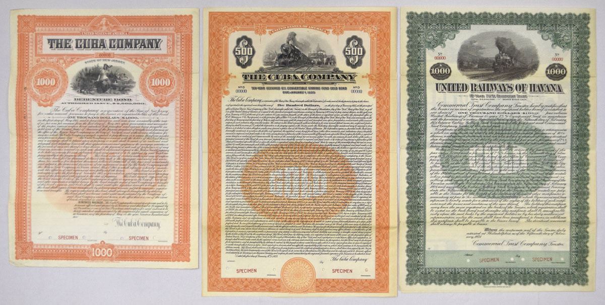 Cuba, 1902-25. Lot of 3 Specimen Coupon Bonds, Includes: 1902, Cuba Co., $1000 6% Bond with orange border; 1925, $500 6% Secured Convertible Sinking Fund Gold Bond with orange border; 1921, United Railways of Havana, $1000 7 1/2% Equipment Trust. Bonds all have Specimen overprints, POCs, and range from VF to XF condition. ABNC. (3). Sold "AS IS" no returns accepted.