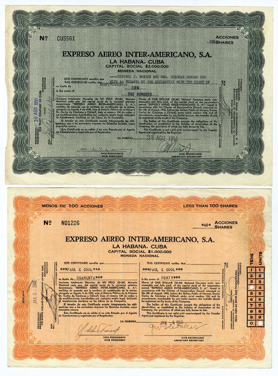 Havana, Cuba, 1946-51. Lot of 2 I/U Stock Certificates, Includes: 40 Shares Capital Stock, Black print with orange border and underprint, S/N NO1226; 100 Shares Capital Stock, Black print with steel gray border and underprint, S/N CU5561. Both are in Fine to VF condition and printed by CBNC. (2). Sold "AS IS" no returns accepted.