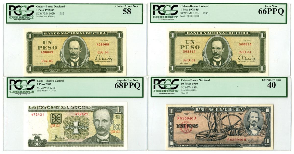 Cuba, 1960 to 2002. Lot of 4 Issued Banknotes, Includes: 1960, 10 Pesos, P-88c, S/N P835940A pp C3, PCGS graded Extremely Fine 40; 1982, 1 Peso, P-102b, S/N CA04 438069, PCGS graded Choice About New 58; 1985, 1 Peso, P-102b, S/N AD04 508314, PCGS graded Gem New 66 PPQ; 2002, 1 Peso, P-121b, S/N GB-01 472421, PCGS graded Superb Gem New 68 PPQ. (4). Sold "AS IS" no returns accepted.
