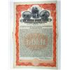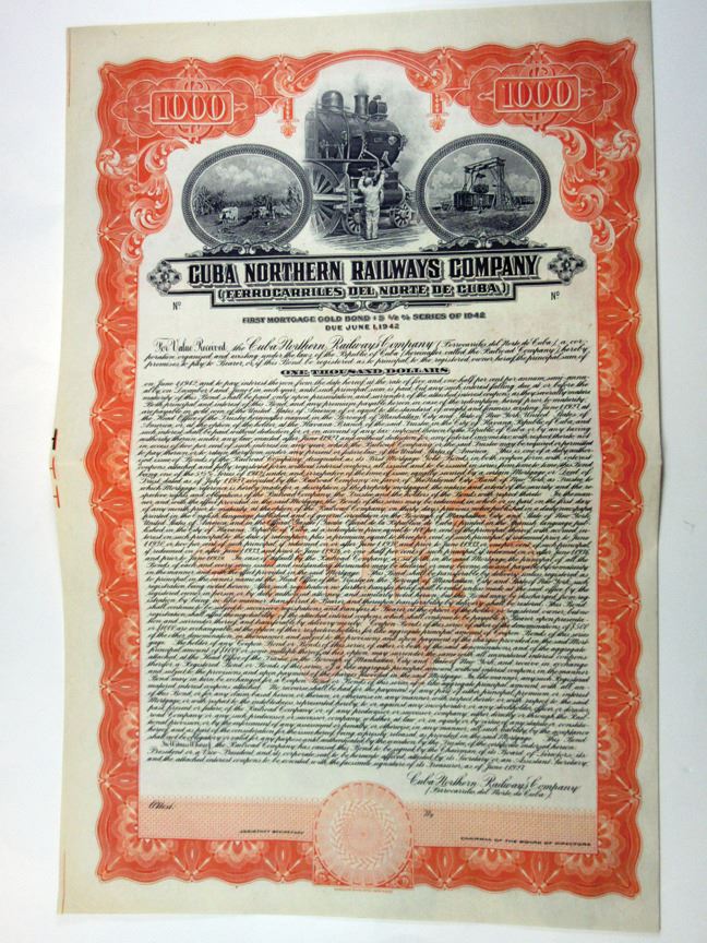 Cuba, 1927, $1000, 5 1/2% 1st Mortgage Gold Specimen Bond, Vertical format, Coupons Attached, Black print on orange border and underprint, Man fixing locomotive top center flanked left by cattle on sugar plantation and flanked right by locomotive loading sugar cane, VF-XF condition, HBNC.