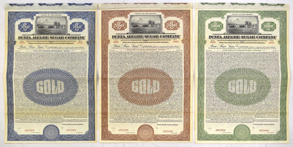 Cuba (Inc. in Delaware), 1922. Lot of 3, 15 Year 7% Sinking Fund Convertible Debenture Coupon Bonds in 3 different denominations: $100 in blue, $500 in brown, $1000 in green. All bonds have vignette of men harvesting tobacco, Specimen overprints and POCs, are in VF to XF condition, and printed by ABNC. (3). Sold "AS IS" no returns accepted.