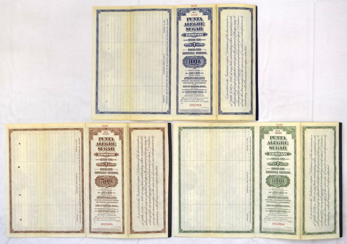 Cuba (Inc. in Delaware), 1922. Lot of 3, 15 Year 7% Sinking Fund Convertible Debenture Coupon Bonds in 3 different denominations: $100 in blue, $500 in brown, $1000 in green. All bonds have vignette of men harvesting tobacco, Specimen overprints and POCs, are in VF to XF condition, and printed by ABNC. (3). Sold "AS IS" no returns accepted.