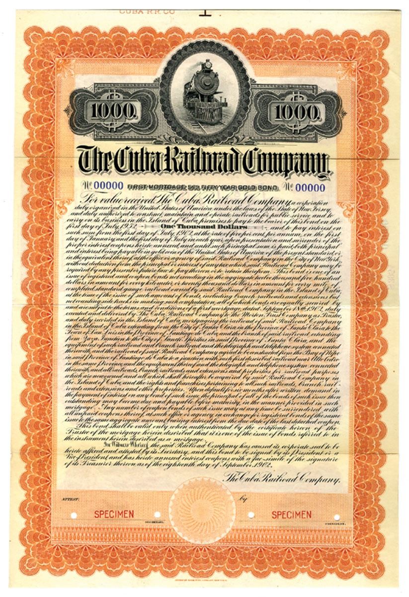 Cuba (Inc. in New Jersey), 1902, $1000, 5% 1st Mortgage 50 Year Gold Specimen Bond, Black on orange border and underprint, Oncoming locomotive top center, POC's red SPECIMEN overprints and blue s/n "00000", XF condition, ABNC. Unlisted variety without overprint on face.