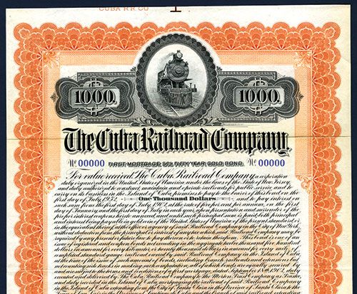 New Jersey, 1902, $1000, 5% 1st Mortgage 50 Year Gold Specimen Bond, Black on orange border and underprint, Oncoming locomotive top center, POC's red SPECIMEN overprints and blue s/n “ 00000” , VF condition, ABNC.