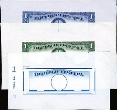 1949. P-Unlisted (similar to P-77). 1 Peso Essay banknote back proofs for Cuba's 1949 issue by Security BNC that was rejected by Cuba. Large die proof on thin white paper. Includes 2 Complete back proofs, one in green and the other in blue as well as a progressive proof of the back in blue without the Cuban arms in middle, denomination on sides and text on the bottom. The progressive proof has the denominations separated and on the left side of the note. The progressive proof is dated 4-26-49. The text at the bottom of both complete back proofs states "Este Billete Tiene Curso Legal Y Fuerza Libertoria Ilimitada De Acuerdo Con La Ley, Para El Pago De Toda Obligacion Contraida O A Cumplir En El Territorio Nacional". Choice unc. condition. SBNC.