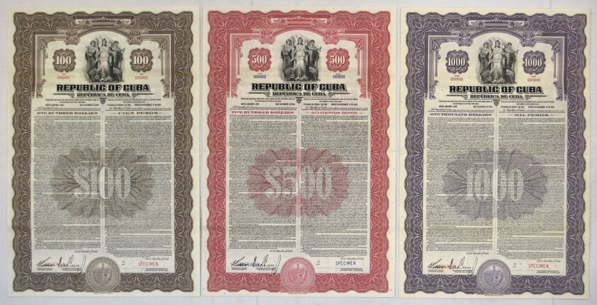 Cuba , 1941. Lot of 3 Specimen Bonds, Includes: 100 Pesos 4 1/2% Bond, Black with brown border; 500 Pesos 4 1/2% Bond, Black with red border; 1000 Pesos 4 1/2% Bond, Black with purple border. All bonds are printed in Spanish and English, have the same vignette, have Specimen overprints, POCs, are in VF to XF condition, and printed by ABNC. (3). Sold "AS IS" no returns accepted.