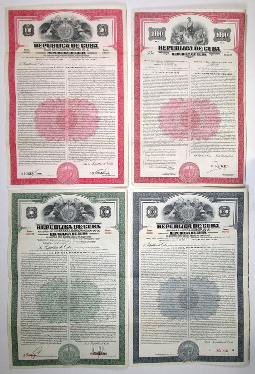 Cuba , 1949-1954. Lot of 4 Specimen Bonds, Includes: 1949, 100 Pesos 4% Bond, Black with pink border; 1949, 1000 Pesos 4% Bond, Black with blue border; 1952, 1000 Pesos 4% Bond, Black with green border; 1954, 1000 Pesos 4% Bond, Black with red border. All are printed in Spanish and English, have Coupons attached, Specimen overprints, POCs, are in VF+ condition, and printed by ABNC. (4). Sold "AS IS" no returns accepted.