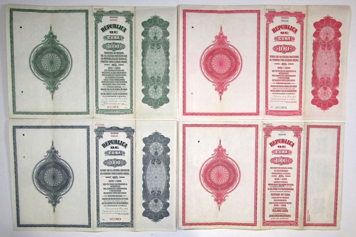 Cuba , 1949-1954. Lot of 4 Specimen Bonds, Includes: 1949, 100 Pesos 4% Bond, Black with pink border; 1949, 1000 Pesos 4% Bond, Black with blue border; 1952, 1000 Pesos 4% Bond, Black with green border; 1954, 1000 Pesos 4% Bond, Black with red border. All are printed in Spanish and English, have Coupons attached, Specimen overprints, POCs, are in VF+ condition, and printed by ABNC. (4). Sold "AS IS" no returns accepted.