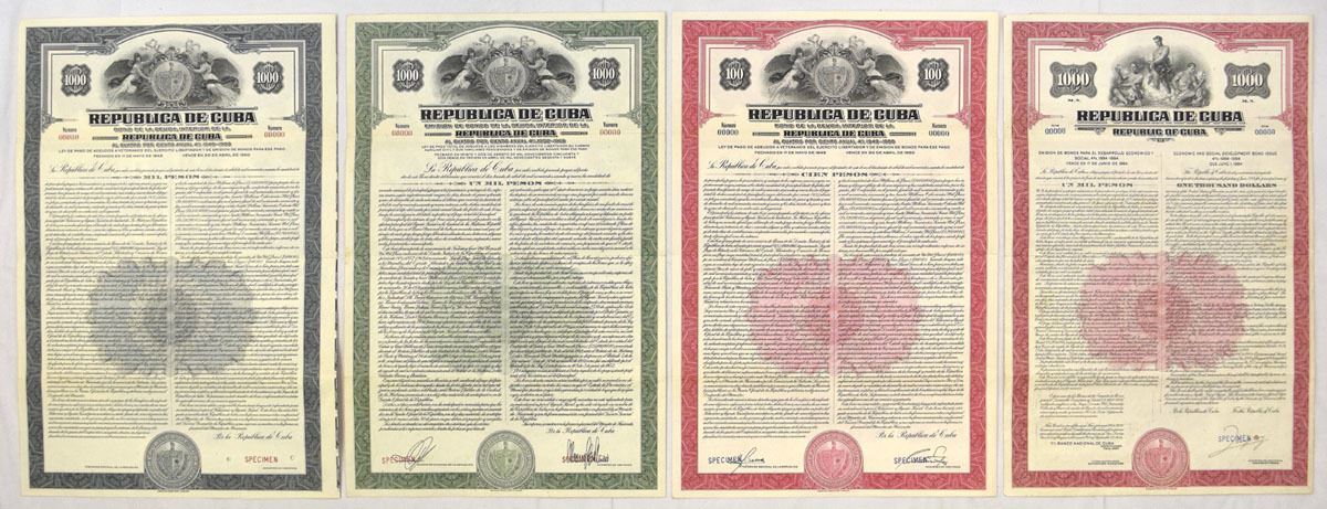 Cuba , 1949-1954. Lot of 4 Specimen Bonds, Includes: 1949, 100 Pesos 4% Bond, Black with pink border; 1949, 1000 Pesos 4% Bond, Black with blue border; 1952, 1000 Pesos 4% Bond, Black with green border; 1954, 1000 Pesos 4% Bond, Black with red border. All are printed in Spanish and English, have Coupons attached, Specimen overprints, POCs, are in VF+ condition, and printed by ABNC. (4). Sold "AS IS" no returns accepted.