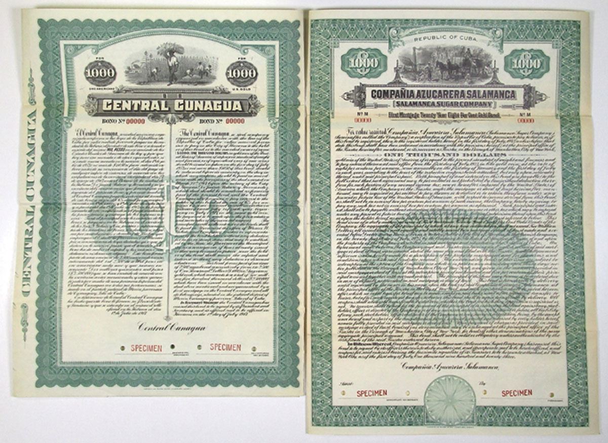 Cuba, 1917 and 1923. Lot of 2 Specimen Bonds, Includes: 1917, Central Cunagua 1000 Pesos 6% Coupon Bond; 1923, Salamanca Sugar Co. $1000 8% First Mortgage Twenty Year Gold Coupon Bond. Both have green border and underprint, have vignettes involving sugar productions, Specimen overprints, POCs, are in VF to XF condition, and both printed by ABNC. (2). Sold "AS IS" no returns accepted.