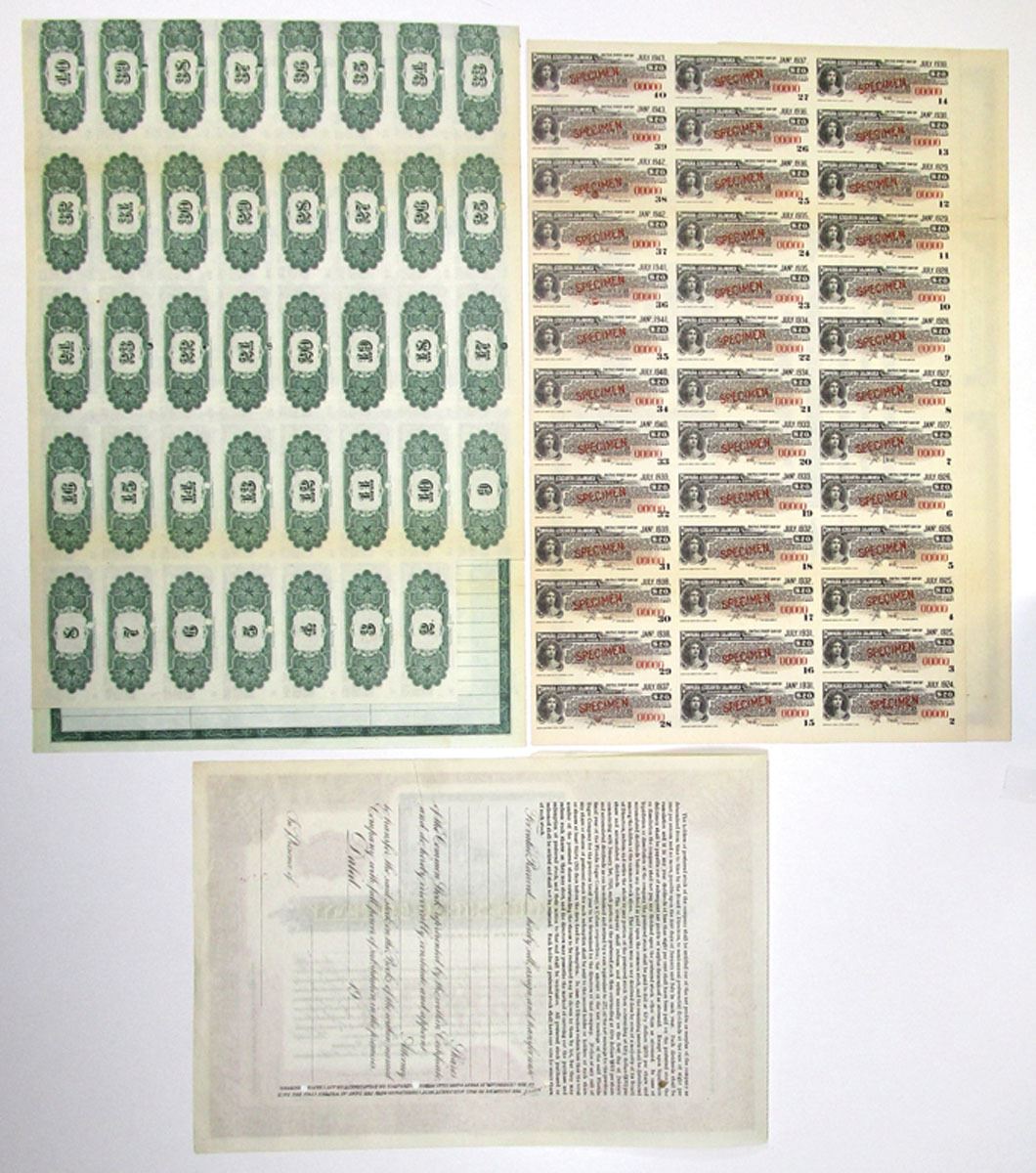Cuba, ca.1920 to 1923. Lot of 3 Specimen Certificates, Includes: Punta Alegre Sugar Co., ca. 1900, <100 Shares Common Stock, Black on brown border and underprint with sugar cane field and workers with oxen pulled wagon at top; Ermita Sugar Co., 1922, $500 Specimen 7 1/2% Gold Coupon Bond, Green Border with Sugar Cane Field/Workers Vignette; and, Salamanca Sugar Co., 1923, $500 Specimen 8% First Mortgage Gold Coupon Bond, Black print with brown border and underprint, Sugar Cane Field/Workers at top. All items have Specimen overprints and POC's and are in XF to AU condition, ABNC. (3). Sold "AS IS" no returns accepted.