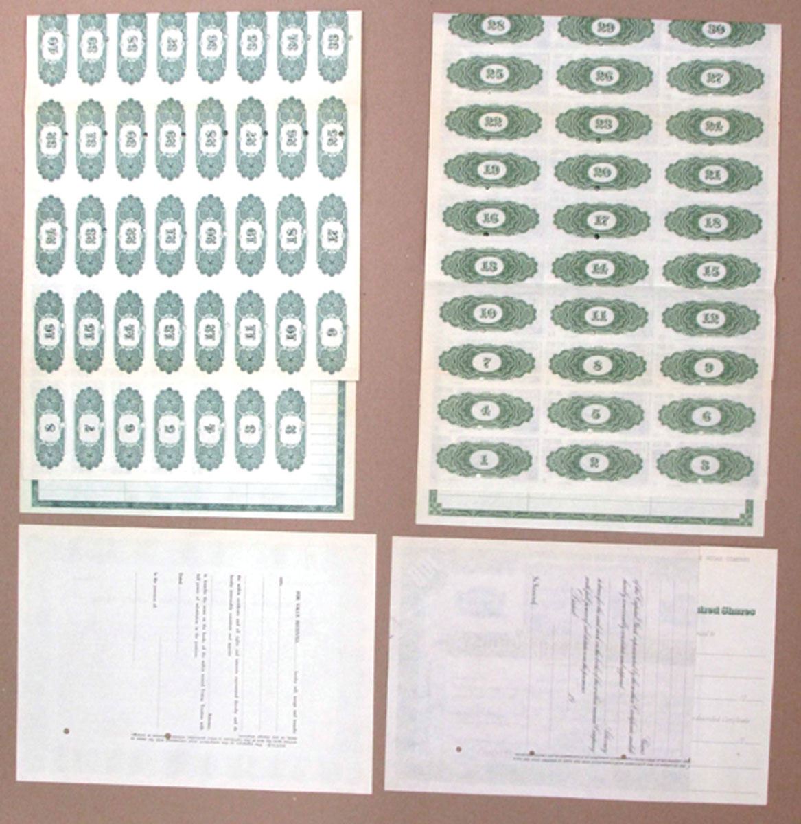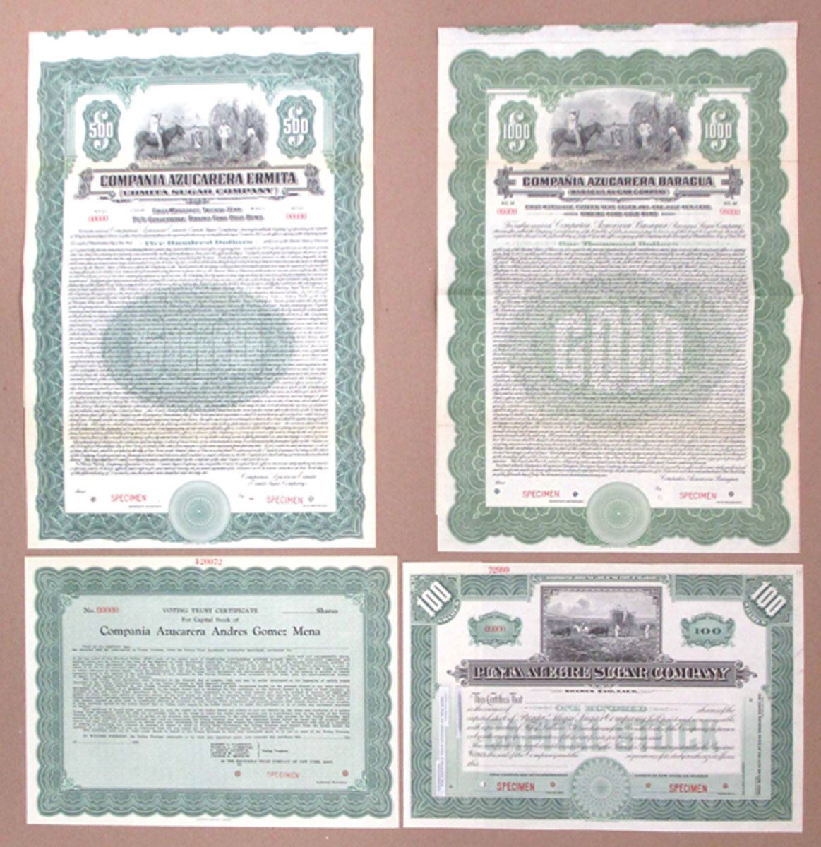 Cuba, 1922 to 1925. Lot of 4 Specimen Stock or Bond Certificates, Includes: 1922, $1000, Baragua Sugar Company; 1922, $500, Ermita Sugar Company; ND (ca.1910-20), 100 Shares, Punta Alegre Sugar Company; and,1925, Odd Shares, Andrés Gomez Mena Sugar Company. These were significant players in the sugar industry during the late 19th and early 20th centuries. Each company operated extensive sugarcane plantations and mills, contributing to the region's status as a leading sugar producer. Baragua and Ermita were known for cultivating high-quality sugarcane and processing it into refined sugar, while Punta Alegre was recognized for its innovative production methods. Andrés Gomez Mena specialized in efficient cultivation and processing, enhancing the quality of sugar produced. Together, these companies not only fueled the growth of the sugar industry but also provided employment and supported local economies, highlighting the historical importance of sugar production in the area. Sold "AS IS" no returns accepted.