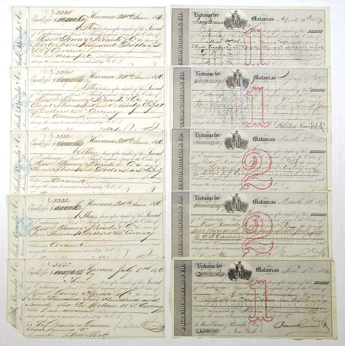 Havana & Matanzas Cuba, 1876-77. Lot of 10 Bills of Exchange, 5 are First of Exchange drafts, and, 5 are Second of Exchange drafts, Certificates range from Fine to VF+ condition. (10). Sold "AS IS" no returns accepted. Manuel Rionda (1854–1943) was a Spanish-born, US-based sugar baron in Cuba. Rionda co-founded the Czarnikow-Rionda Company with Julius Caesar Czarnikow in 1909. By 1915, he co-founded the Cuba Cane Sugar Company with his family. Rionda married Harriet Clarke, and they resided at Rio Vista estate, a 300-acre estate in Alpine, New Jersey. They had no children, but they raised his orphaned nephew, Manuel Enrique Rionda. Rionda died in 1943. A tower designed by architect Charles Rollinson Lamb on his former estate still stands in Alpine, New Jersey, one of the most affluent zip codes in the United States.