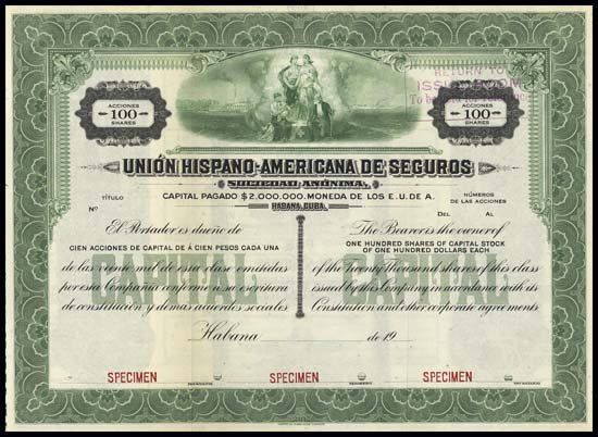 3 different specimen bonds. Havana. 19-- (ca.1900-1920). 1 and 50 Shares with purple border and 100 Shares with lime green border. Text in Spanish and English. Allegorical women with old man and woman withbaby. Red SPECIMEN overprint and POC. Coupons attached. Fine-VF Condition. ABNC. Scarce group.