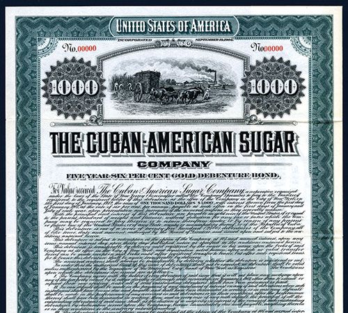New Jersey, 1907, $1000, 5 Year 6% Gold Specimen Bond, Black on green border and underprint, Sugar cane plantation top center, POC's red SPECIMEN overprints and red s/n “00000 “, VF condition, ABNC.