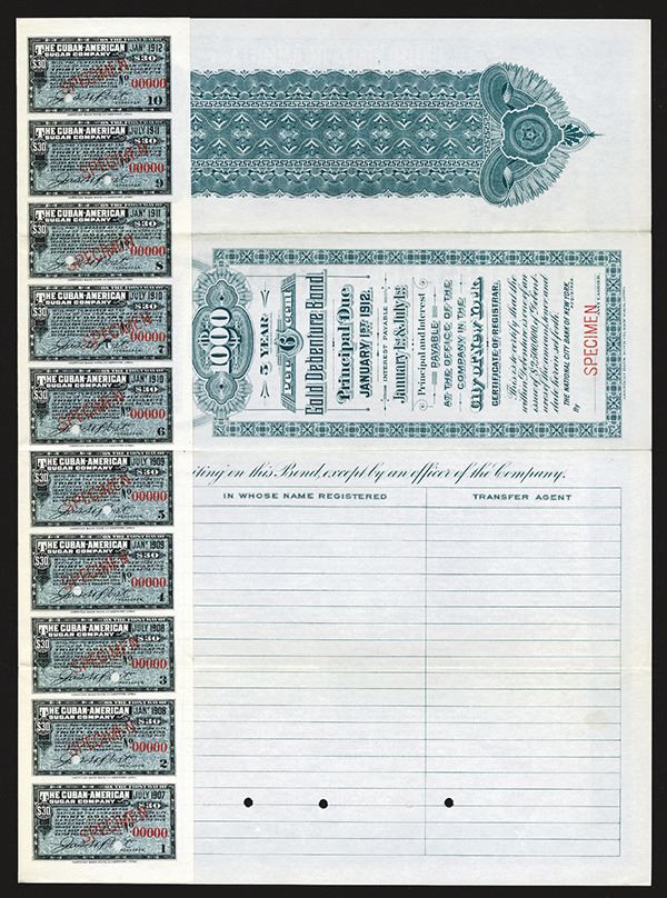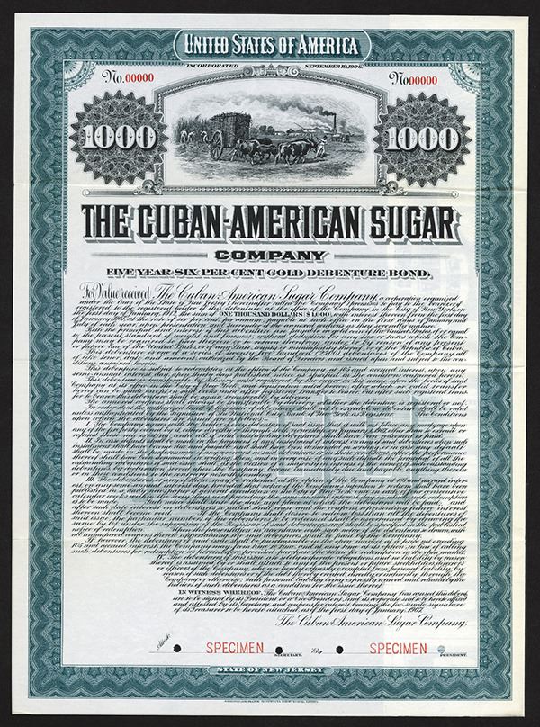 New Jersey, 1907, $1000, 5 Year 6% Gold Specimen Bond, Black on green border and underprint, Sugar cane plantation top center, POC's red SPECIMEN overprints and red s/n "00000", VF condition, ABNC.