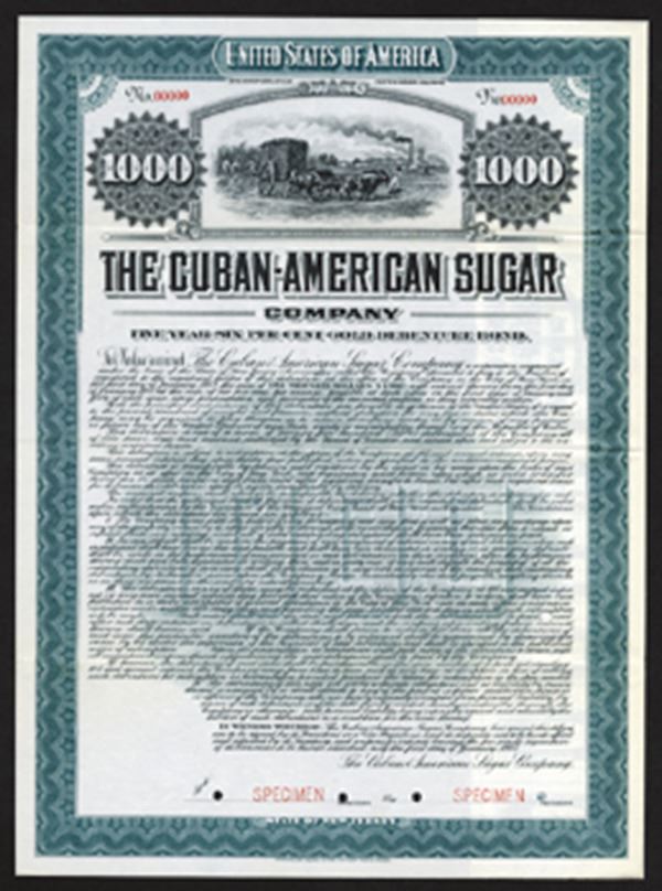 Cuba (Inc. in New Jersey), 1907, $1000, 5 Year 6% Gold Specimen Bond, Black on green border and underprint, Sugar cane plantation top center, POC's red SPECIMEN overprints and red s/n "00000", VF condition, ABNC.