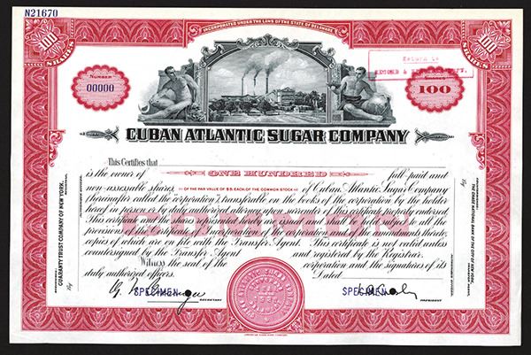 Cuba, 100 Shares, Common, Specimen Stock, Black on red border, allegorical men flank sugar mill, Specimen overprints, POC's, XF, ABNC. Rare.