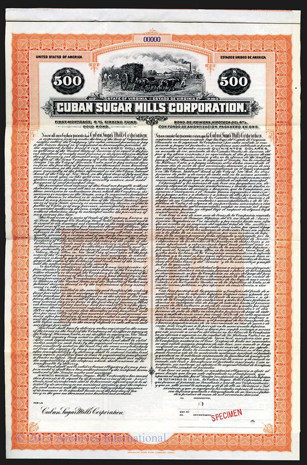 Cuba, Virginia incorporation, 1917, $500, Specimen bond, Ox cart, mill, and sugar fields, Orange, ABNC, POC's XF.