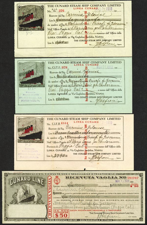 Great Britain/Italy. Receipts from 1918, 1919, 1928 in Italian for Napoli. Receipts for cash in Lire, with Dollar conversion.