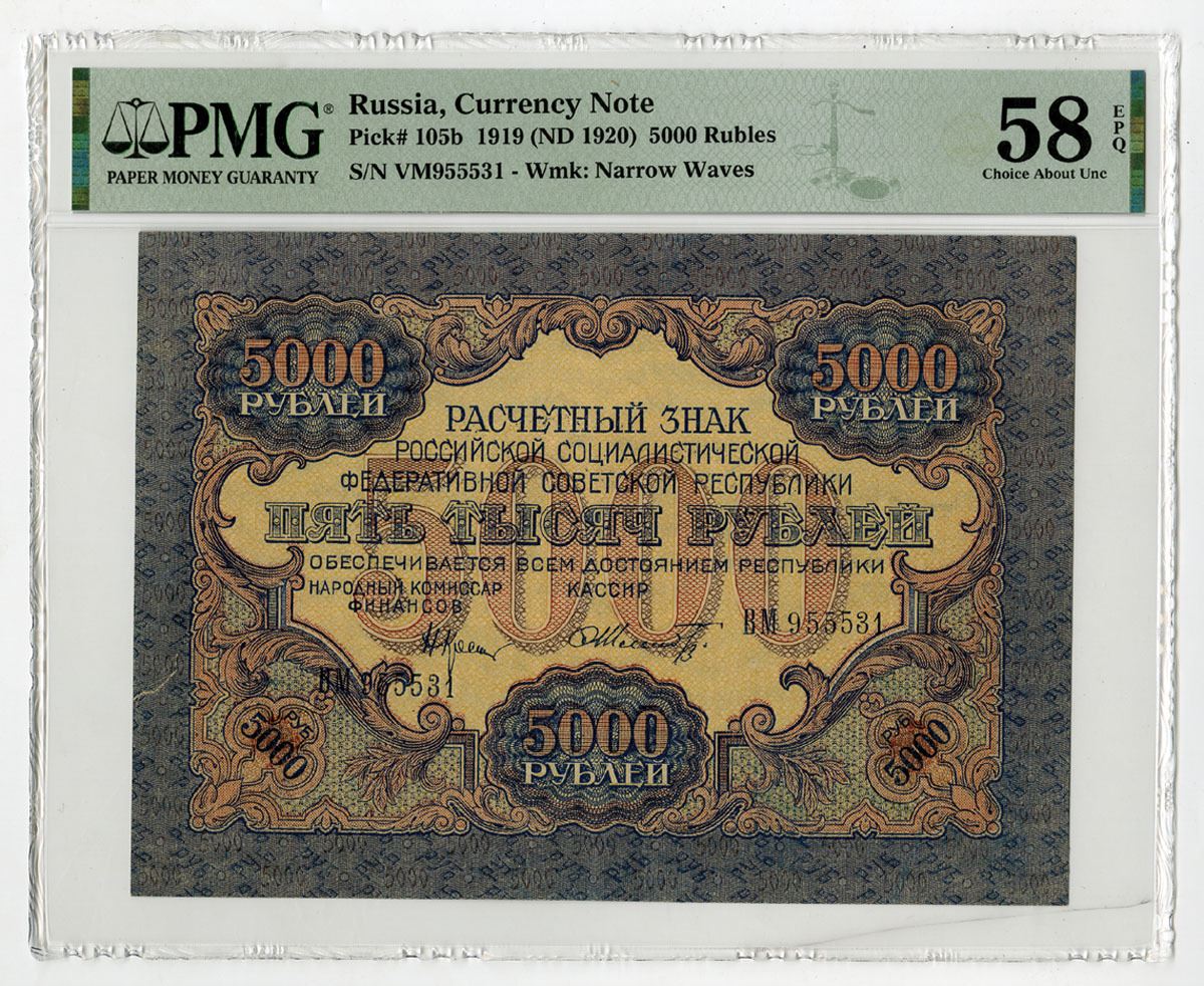 Russia, 1919 (ND 1920). 5000 Rubles, P-105b, Issued Banknote, Dark blue on yellow and multicolor underprint, S/N VM955531, Watermark: Narrow Waves, PMG graded Choice About Uncirculated 58 EPQ.