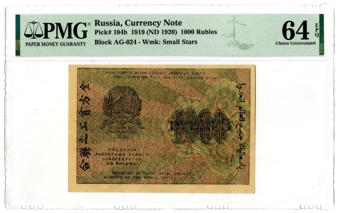 Russia. 1919 (ND 1920). 1000 Rubles, P-104b, Issued banknote, Black on green underprint, Block AG-024, Watermark: Small Stars, PMG graded Choice Uncirculated 64 EPQ. This is the highest graded out of 3 graded in the PMG census.