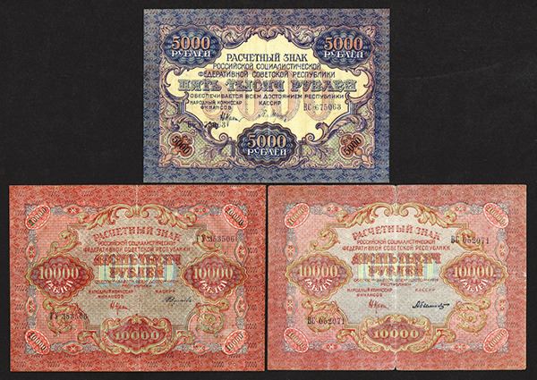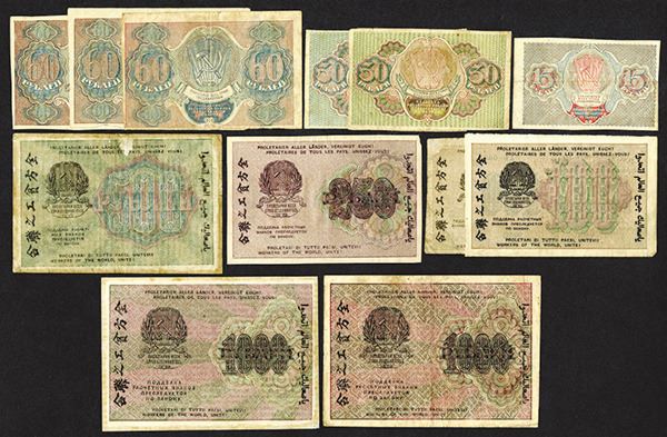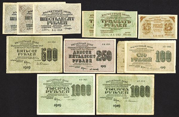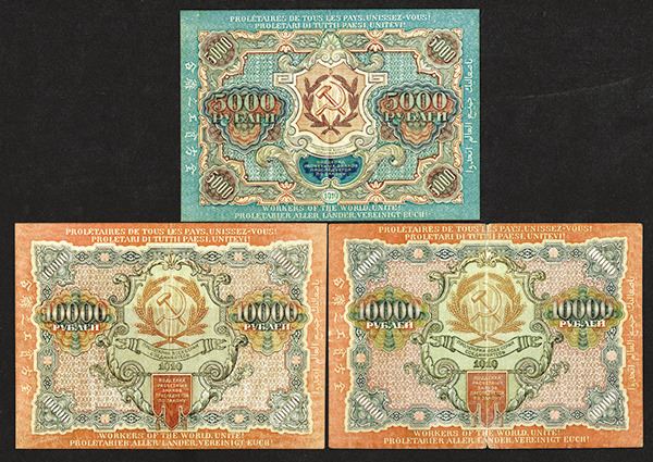 Russia - R.S.F.S.R. 15, 30, 60, 100, 250, 500, 1000, 5000, 10,000 Rubles. P-98, 99 (2), 100 (3), 101 (2), 102a, 103a, 104a (2), 105b, 106b (2). Many with "Workers of the World, Unite!" legend in numerous languages. Mostly Fine to Very Fine, some better. 15 pieces. (The Silicon Valley Collection)