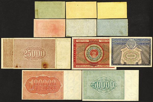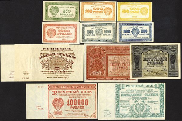 Russia - R.S.F.S.R. 100, 250, 500, 1000, 5000, 10,000, 25,000, 50,000, 100,000 Rubles. P-108, 109, 110a, 111b (2), 112a, 113, 114, 115a (stain), b, 116a, 117a. Mostly Very Fine to AU or better. 12 pieces. (The Silicon Valley Collection)