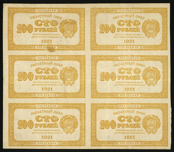 Block of 6 notes. 1921. 100 Rubles, P-108, Issued banknotes. Yellow on white, back with yellow underprint and no printing. VF+ to XF condition with small stain on the top left pair. Scarce as uncut block.