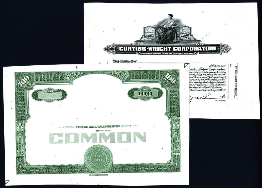 Delaware, 19xx, 100 Shares, Proof Stock, Intaglio printed black on green border and underprint, Vignette of allegorical woman flanked by two small scenes of biplane and monoplane at airport, XF to Uncirculated condition, Quayle & Son.