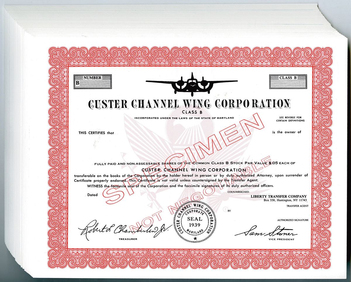 Maryland, Lot of over 70 pieces, all are Odd Shares Specimen Class B Stock Certificates, Black text with red border and pink undertint, Illustration of plane approaching head-on at top center. Red specimen overprint, XF condition. The Custer Channel Wing Corporation was an American aircraft manufacturer that specialized in the design of aircraft utilizing the Channel wing. The company was active between 1951 and the 1970s. Over 70 pieces.