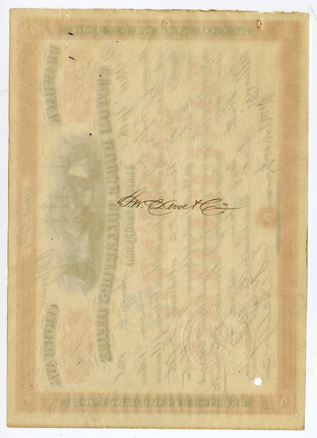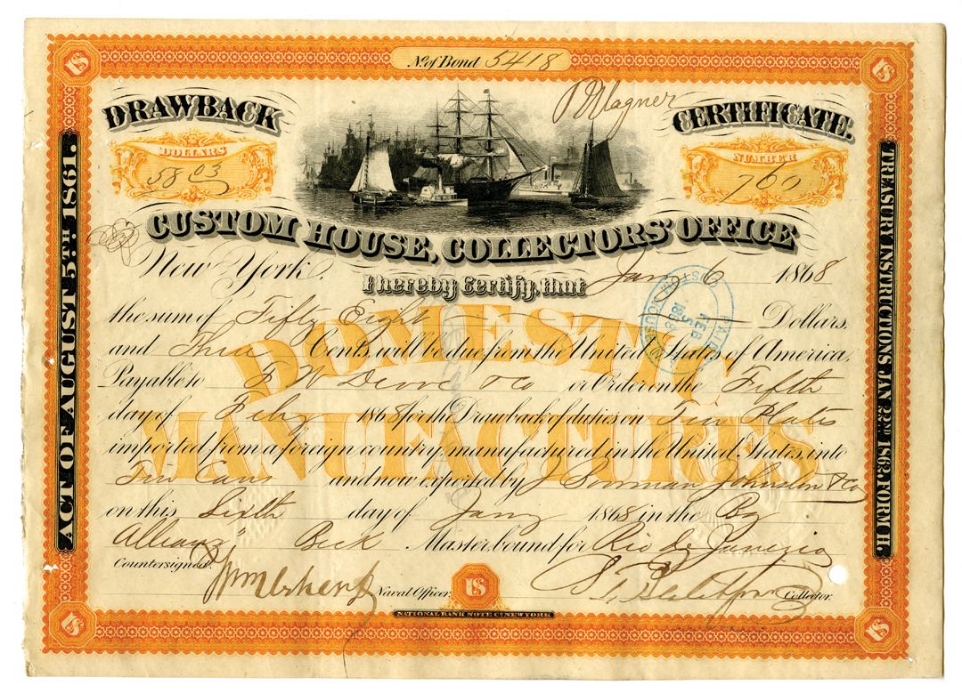 New York, 1868. $58.03 I/C Drawback Certificate Issued by the Custom House, Collectors' Office for the "Drawback of duties on Tin Plates imported from a foreign country, manufactured in the United States, into Tin Cans and now exported" on January 6th, 1868, bound for Rio de Janeiro. S/N 760, Black text with orange border and underprint, Ships in harbor at top center, Blue "Paid" handstamp at center, POCs. This drawback was due to F.W. Devoe & Co., a paint manufacturing company. VF condition, NBN.