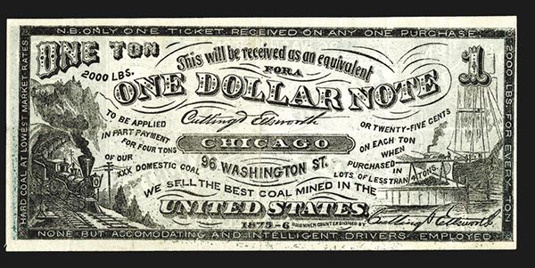Chicago, Illinois. Advertising Note. Cutting & Ellsworth 1875-76. One dollar on 4 tons of coal or 25 cents on one ton. Very Fine.